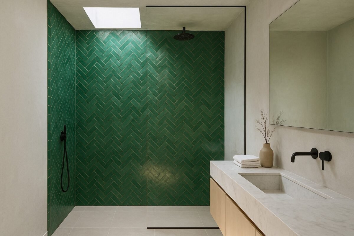 - Zellige artesanal em padrões como herringbone: reforçam o aspecto manual e único, muito usado em cozinhas e banheiros.